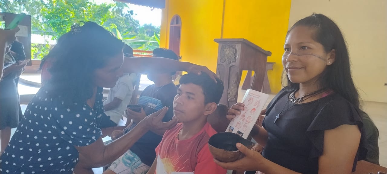 Em cada momento valorizamos nossa LÍNGUA e CULTURA TICUNA, o processo de INCULTURAÇÃO, a IGREJA SINODAL com rosto MAGÜTA na tríplice fronteira… momento forte espiritualidade foi o RITO do JENIPAPO em que as mulheres anciãs e sabias de nosso povo nos pintaram, a cada um e cada uma, com nosso CLAN e NOME CULTURAL que recebemos no dia de nosso nascimento…