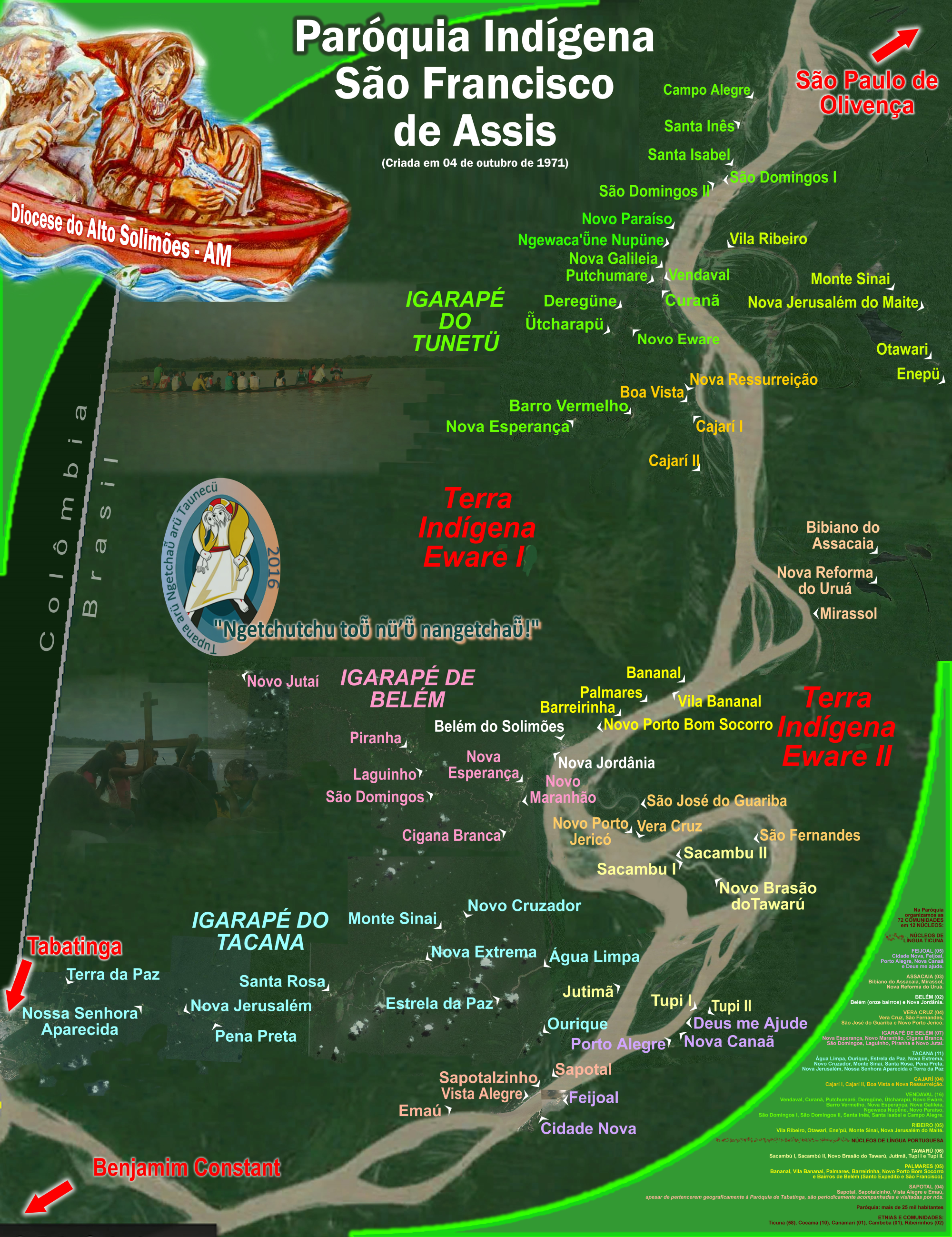 Belém do Solimões – aonde nós Frades Menores Capuchinhos, com a Fraternidade São Francisco de Assis, moramos no CONVENTO e CASA PAROQUIAL (Rua Amazonas n. 04, Bairro Redenção) – é hoje a MAIOR ALDEIA INDÍGENA do BRASIL alcançando uma POPULAÇÃO Geral de 11.000 moradores indígenas (Ticuna e uma pequena parte Kokama).